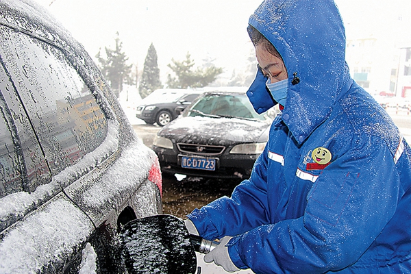1月21日,山东烟台石油加油站员工冒雪为客户加油。
