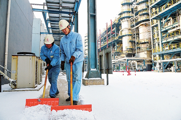 1月23日,石家庄炼化职工清扫巡检线路上的积雪。