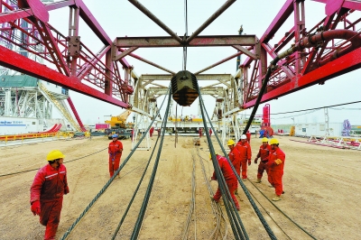 春节期间,国内最大的储气库——文23储气库建设施工正紧张进行。中原石油工程公司钻井一公司50755钻井队在文23储8-2井组安装井架,用两天时间顺利完成搬迁施工,比计划提前一天半。图为2月21日施工现场。马洪山 摄 |