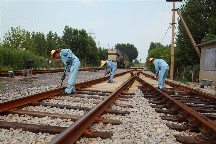 ![]() 在夏季,铁路线可是一个热的地方。气温三十六七度,而铁路现场几乎都在四十多度。人在铁路边上一站,便是“桑拿”,一会儿衣服便能拧出水来。大家在现场若戴安全帽,头上便汗水淋淋,工作中经常低头,安全帽便向下掉,单位决定大家戴草帽,遮阴又防晒。 张锦亮扛着长把铁锤检查固定钢轨的防爬器的固定情况,时不时要用铁锤敲打敲打,让其更加牢固。班员们则拿着三四斤重的扳手,检查、紧固着钢轨上的固定螺栓。钢轨路基上有杂草,他们也要拔掉。