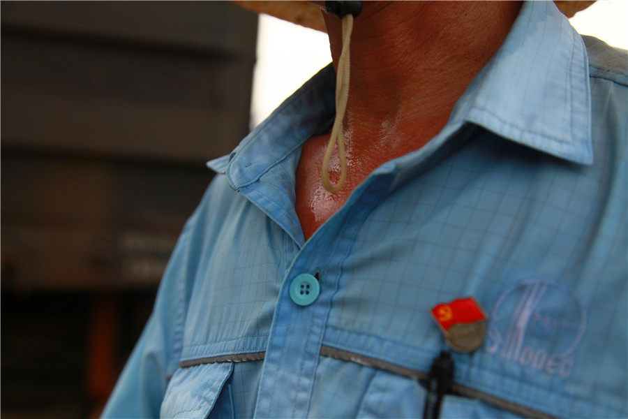 ![]() 张锦亮头顶草帽、手上是皮革制成的劳保手套,扛着四五斤重的长把铁锤,蓝色的工作服背上五分之四被汗水浸透,几乎变成了透明,衣物的纹理清晰可见。上衣胳膊肘的上部也同样如此。