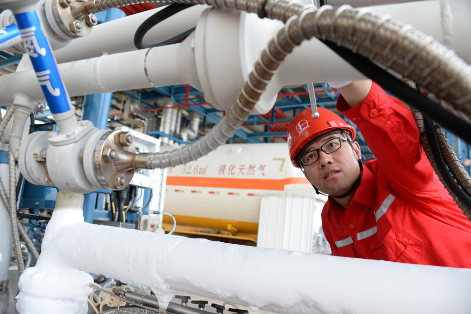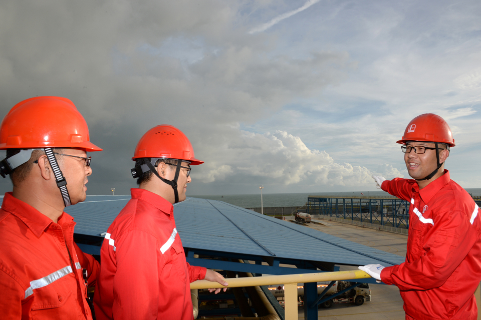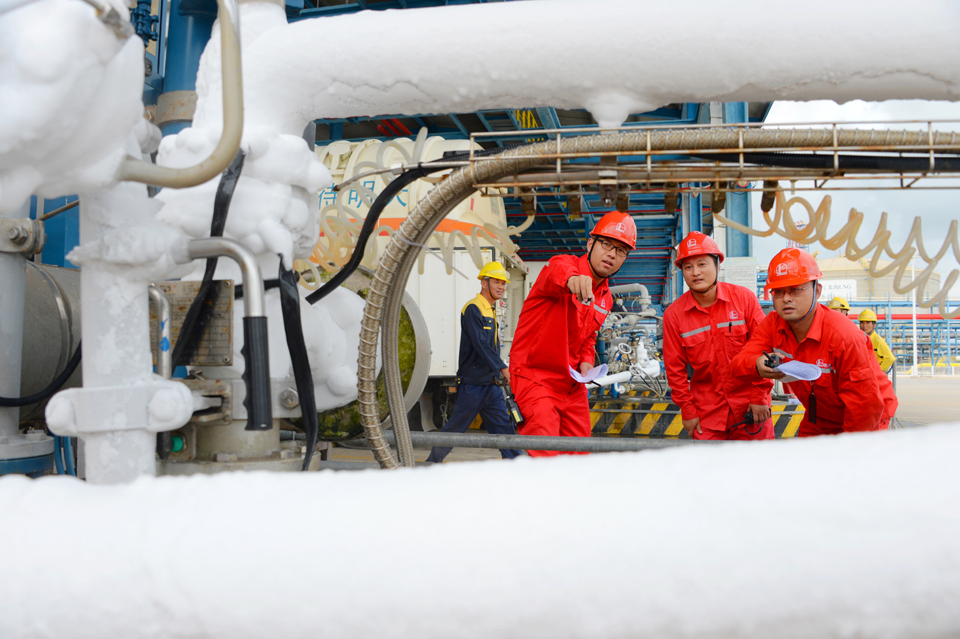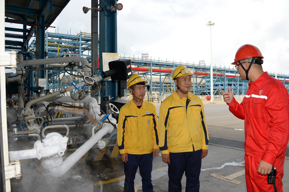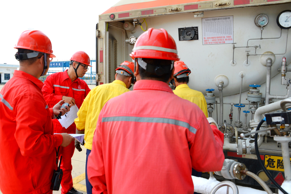 图10:在生产运行中发现问题,李军就和同事们一起琢磨,想办法优化工序,解决问题。图为槽车充装站技术人员正在对优化后的氮气吹扫工艺进行再确认。