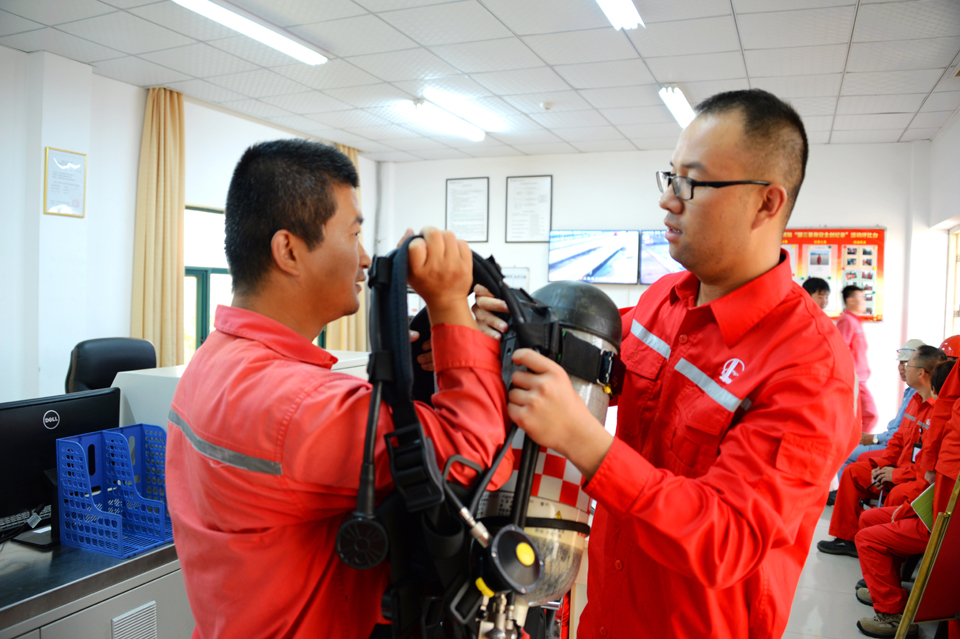 图8:安全、生产两手都要硬,李军正在随机抽查班组人员空呼使用情况。