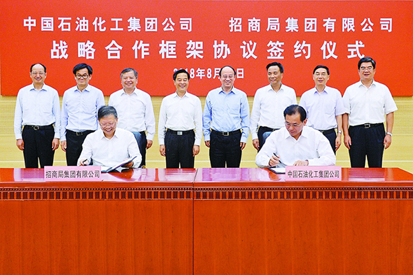 8月20日,中国石化与招商局集团有限公司战略合作框架协议签约仪式在总部举行。集团公司董事长、党组书记戴厚良会见招商局集团董事长、党委书记李建红一行,双方表示将进一步扩大合作,积极发挥各自优势,实现资源共享、优势互补,构建双赢和可持续发展的战略合作伙伴关系。集团公司党组副书记、副总经理李云鹏与招商局集团总经理、党委副书记付刚峰代表双方在协议书上签字。集团公司副总经理凌逸群、招商局集团副总经理王宏参加上述活动。 本报记者 章 铮 摄 |