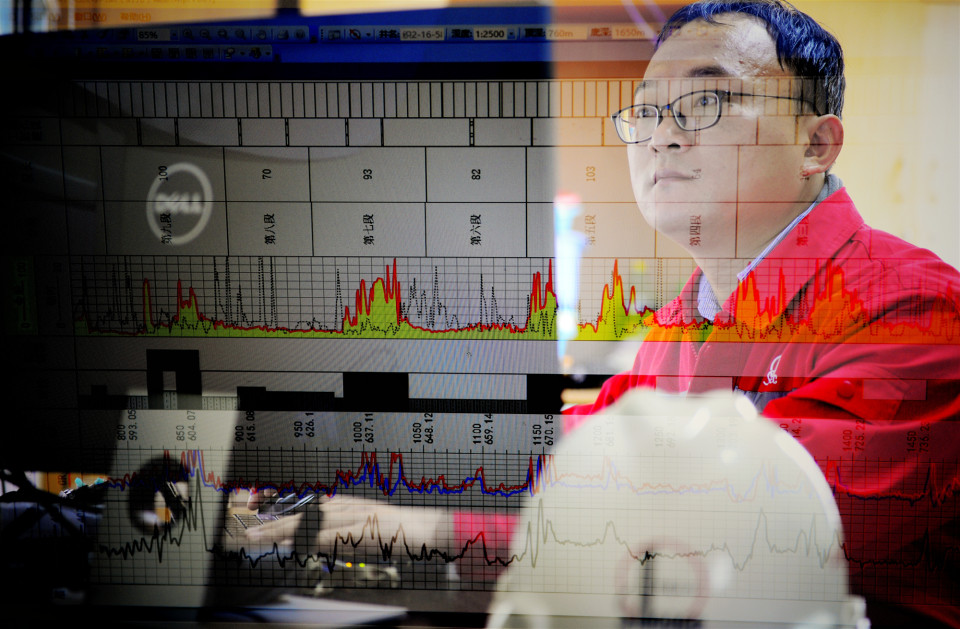 图5:对于水平井而言,高钻遇率是实现高产稳产的关键,研究院组织了5人地质导向组,确保水平井钻遇率。图为研究院高小康在电脑前关注煤层井钻遇情况。