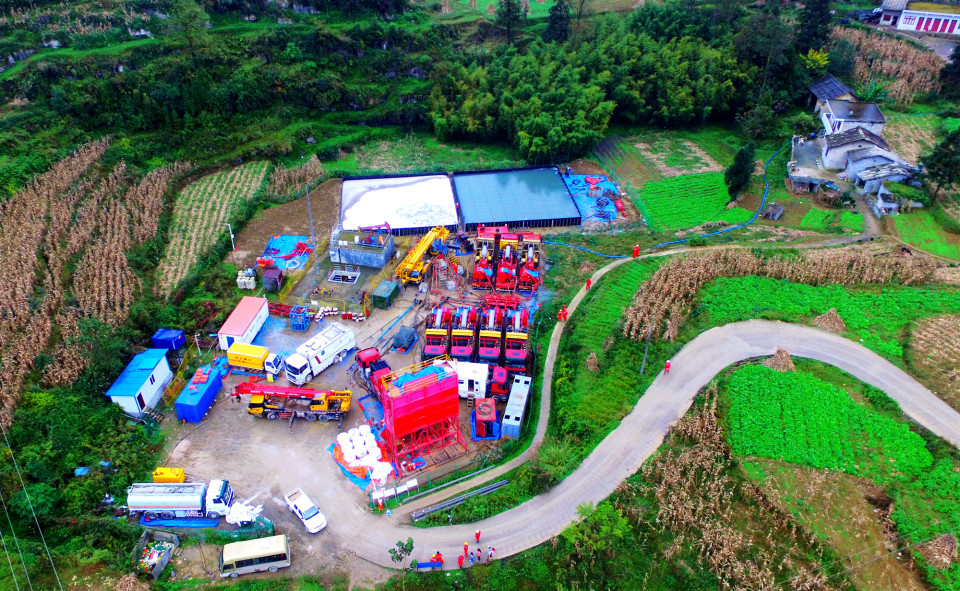 图7:煤层气井需要通过压裂改造提高单井的产气量,大试验井组项目组克服山区供水难、道路状况差等困难,积极组织压裂队伍对钻完井进行压裂施工。图为织平2井压裂现场。