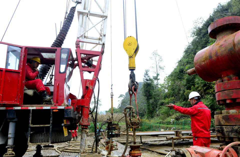 图2:钻井队职工在织金煤层气大试验井组Z65平台钻井施工。