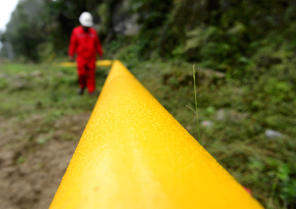 图10:油服中心职工克服山区山峦起伏、沟壑纵横、多坡地、连续阴雨等困难,顺利完成了4500米输气管线的建设,确保煤层气井及时投产。图为油服中心职工在检查输气管线的施工质量。