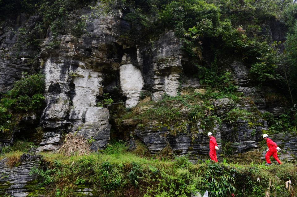 图11:为了保障输气管线的安全,采气队职工定期进行巡回检查。图为采气队职工谢忠峰和蔡道汉在山区进行巡回检查。