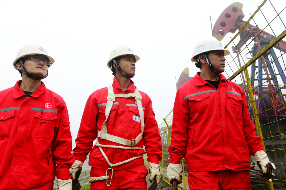 图13:为了保障煤层气井抽油机的安全生产,采气队职工谢忠峰(左一)杨骏、蔡道汉(右一)定期进行维护保养。