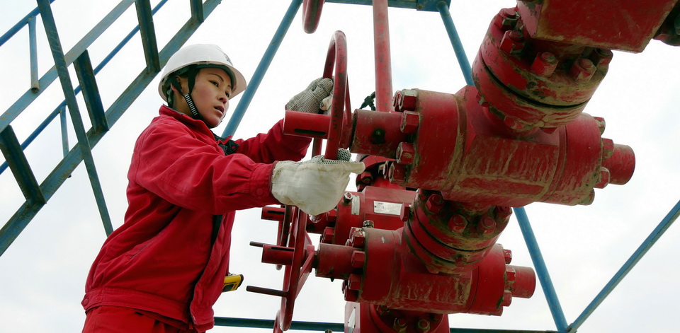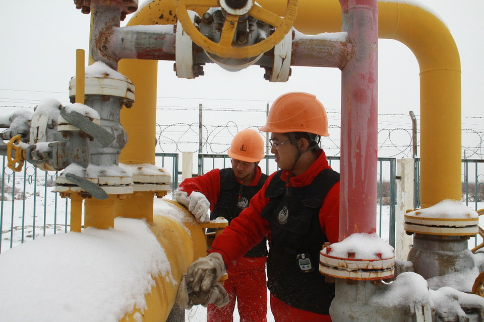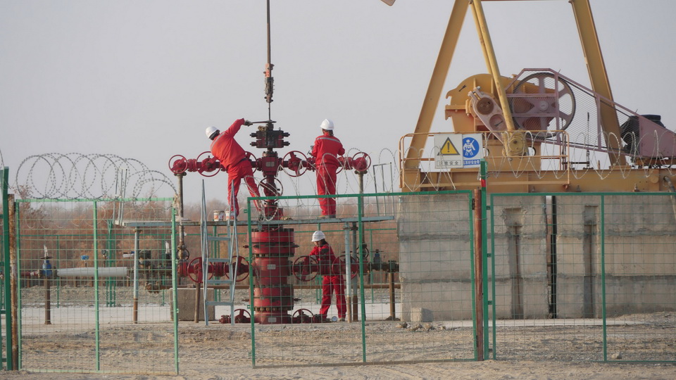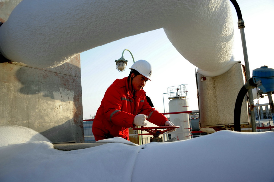 高产高压油气井是西北油田与东部油田最大的不同。要在严酷的冬天管理好这些“宝贝井”,一线员工费尽了心力。图为员工正在检查高产油井。