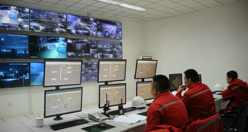 针对油井分散、巡查难度大的现状,西北油田充分发挥远程实时监控系统的作用,在严寒冰雪等恶劣天气,及时发现生产异常。图为员工夜晚在中控室严密监探一线油井和室外重要设备。