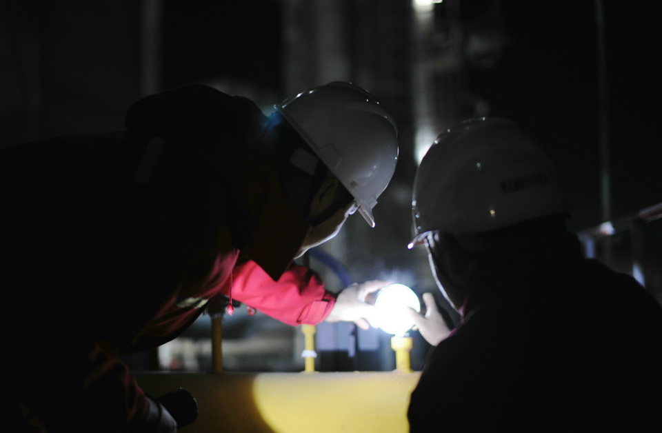 对重点设备重点油井重点关照,加强夜间实地巡查。图为天然气处理站员工深夜巡查低温管线。