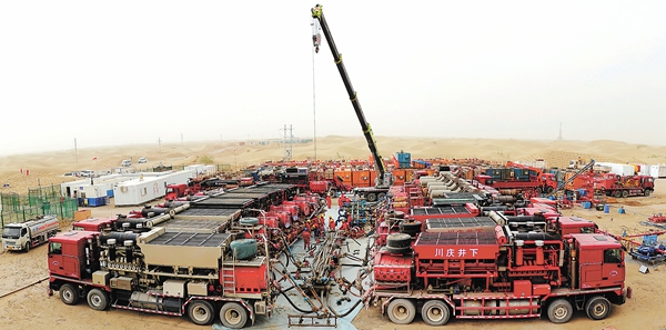 ![]() 5月29日,西北油田采油四厂SHB5-10井酸压投产,喜获高产油气流。该井位于顺北5条带中段,完钻井深8143米。该井的顺利投产,进一步明确了顺北5条带中段成藏规律,标志着中国石化在特深断溶体油藏开发技术方面取得新进展。图为5月27日,SHB5-10井酸压作业队员安装压裂设备。 本报记者 章 铮 摄 李学仁 付 莲 文 |