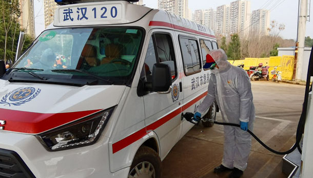 图为中国石化武汉知音大道加油站免费给救护车加油。该站是火神山医院定点加油站。 |