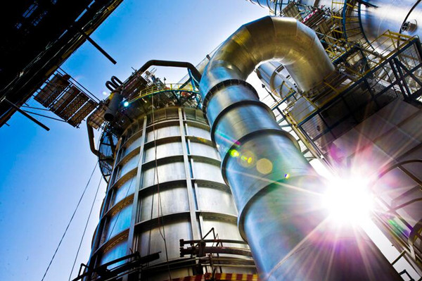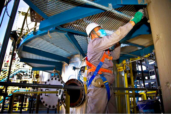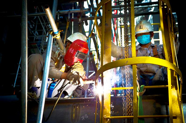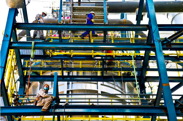 清晨,阳光透过炼塔间隙散发夏日的热情,石化建设者们已经在高高的炼塔上开始一天的工作。
