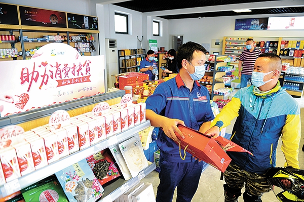 为助力脱贫攻坚,北京石油积极引进贫困地区干果、茶叶等,在易捷店黄金通道设置扶贫产品专柜,增加商品关注度。截至5月底,北京石油今年销售扶贫产品1600余万元。图为6月9日,北京宝捷森加油站员工向顾客推荐扶贫产品。 本报记者 胡庆明 摄 杨 蕊 吕方舟 文