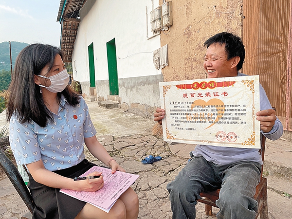 6月15日,湖北秭归石油扶贫干部石美玲来到村民胡开才家里,了解扶贫政策落实情况和他的收入情况。胡开才是秭归县水田坝乡辛家坪三组村民,是低保困难户。在当地政府和秭归石油共同帮扶下,他靠政策帮扶和种植柑橘已于2018年11月顺利脱贫。图为胡开才拿出脱贫光荣证书,表达自己的感激之情。龚华林 摄 |