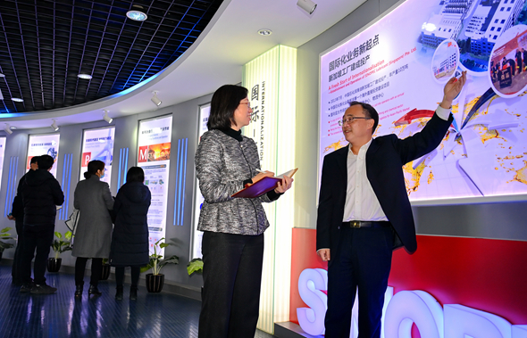 2月25日,刚刚回国的夏鹏(右)向即将启程的马光介绍中国石化润滑油(新加坡)有限责任公司的业务情况,两人交接相关工作。记者 胡庆明 摄