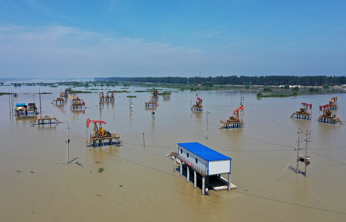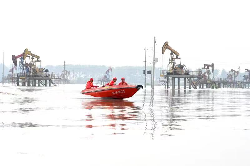 中国石化新闻网讯 入梅以来,受连续强降雨影响,洪泽湖水位持续走高,三河闸从7月7日起连续十几天开闸泄洪,19日最大流量每秒6670立方米,为近年以来泄洪最高值,江苏油田采油二厂位于洪泽湖入江水道400多口油水井被洪水围困。 江苏油田采油二厂立即启动应急预案,组织防汛保生产,确保抢险人员、防汛物资、防汛措施到位。基层生产班站成立抢险突击队,完善专项应急预案,确保处理突发事件时能拉得出、用得上、打得赢。 17日,记者在高集油田看到,这里165口油水井全部泡在洪水中,成为一个个“孤岛”,洪水已经淹没注水井井口,井场水深最深处3米左右,抽油机均在高架平台上。湖区岗位长冉延军告诉记者,高集油田位于泄洪道,油田开发设计时,就建起了高架平台,平台高度高于最大洪水水位,这样洪水来了油田就可以正常生产了。