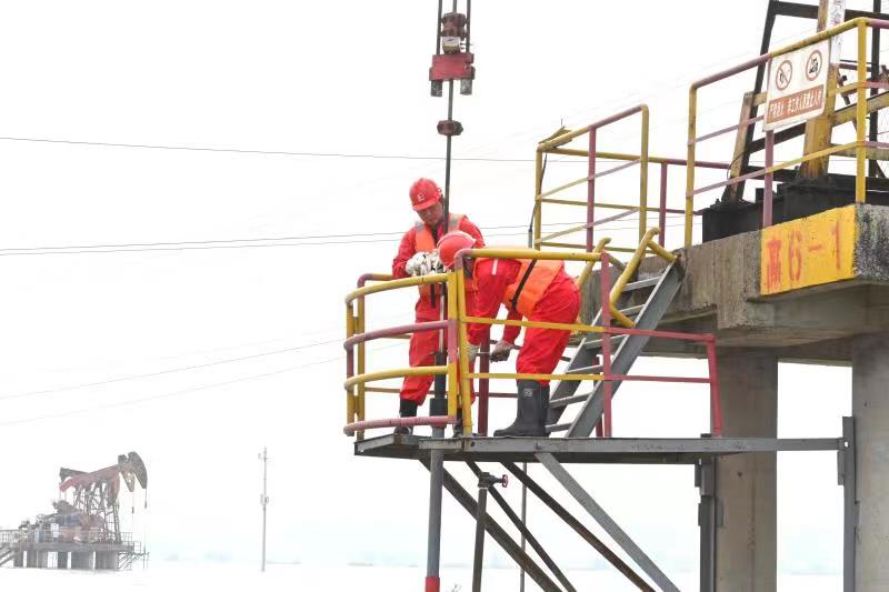 洪水中的高集油区 高集班站副经理钱钦说,洪汛期间,一方面加大湖区生产设施巡察力度,包括采油和注水流程、临水生产设备设施、水体污染防控装备等,一方面通过信息化平台密切监控油井生产情况。 被洪水围困的高6—1平台是湖区生产指挥部,这里有信息化监控系统。值班女工李霞说,我们通过视频可以看到每一口井的生产情况,包括井口压力参数、流量等生产指标,如果有异常或井场周围有影响生产的特殊情况,指挥部就会发出指令,派出员工现场处置。 江苏油田采油二厂有高集、崔庄、墩塘、杨家坝、卞塘、码头庄、黄珏等7个油田位于洪泽湖泄洪道,累计油水井400多口,囊括了这个采油厂的主要油区。洪汛期间,生产管理面临严重挑战,正常的热洗、检泵等作业被迫终止。为了保证洪汛期油田尽可能的正常生产,洪水到来之前,他们对泄洪道上油田生产设施进行了维护保养,组织开展了电力线路检查、平台井架紧固、抽油机维护、管汇流程阀门保养等工作,提前对一些油井进行热洗、检泵等作业,降低汛期躺井(停产)率。