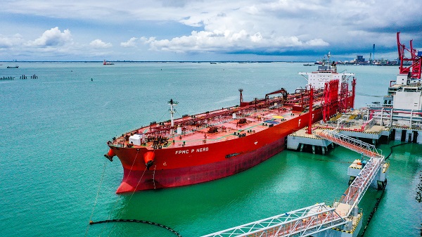 图为中科炼化航煤装运现场 中国石化新闻网讯 7月22日,中科炼化首批4万吨航煤通过10万吨级油轮“台塑英雄”出口荷兰鹿特丹。该船航煤出口将为公司炼油产品销路提供多个选择渠道,对平衡公司炼油生产以及拓宽市场份额起到积极的推动作用。(林江海 张欢文) |