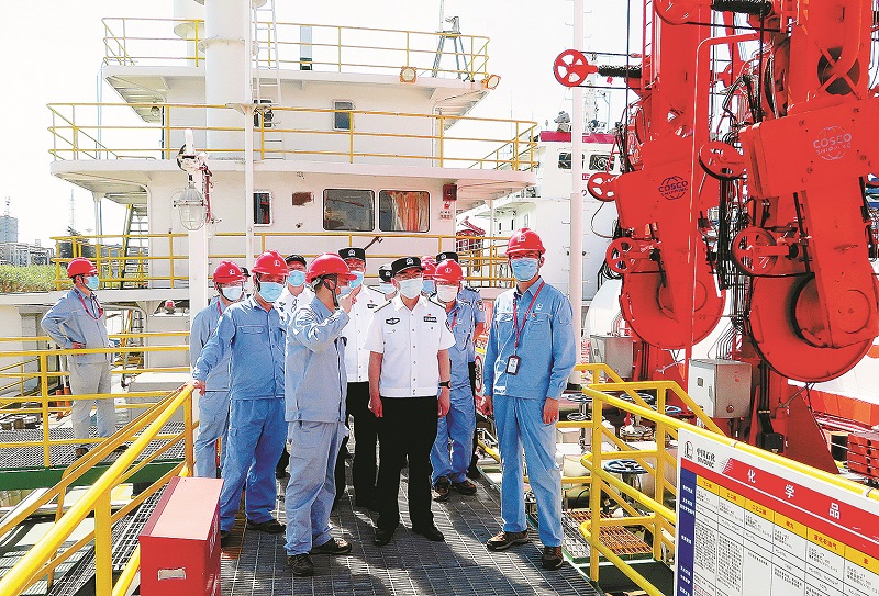 中国石化新闻网讯 扬子石化码头强化涉外船舶和人员管理,根据海事部门要求,暂时对涉外船只进行停航,对明确需要进入码头作业的涉外船只,成立涉外专班,提升防控等级,所有涉外作业由专班专办。图为8月8日,南京市江北新区涉外联防联控指挥部检查组检查扬子石化码头疫情防控工作,肯定了扬子石化的防疫措施。(李维 摄) |
