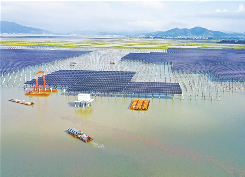 10月10日,浙江省玉环市清港镇苔山塘1800亩海涂100兆瓦“渔光互补”光伏发电项目工程加紧施工。玉环市结合海岛地区土地少、资源少等实际情况,在开展光伏发电项目建设的同时,有效利用地面资源,形成“棚上发电、棚下养鱼”的综合利用新模式,可实现年均发电量约1.4亿千瓦时,有效促进地方经济绿色发展。段俊利摄(中经视觉) |
