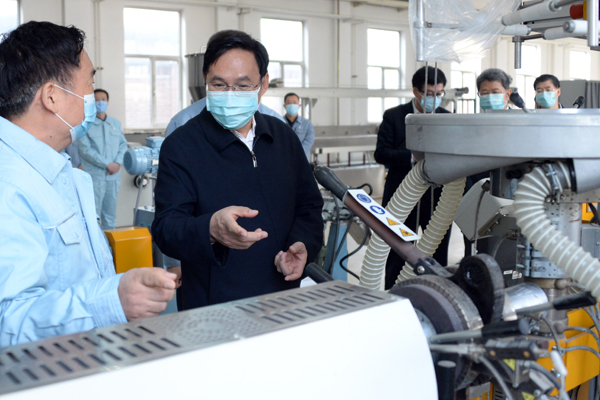 4月7日,张玉卓一行到北京化工研究院塑料技术中心实验室详细了解合成树脂新产品开发和新材料成型加工技术情况。 本报记者 章 铮 摄