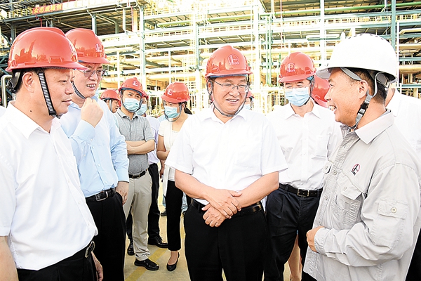 7月29日,张玉卓一行在茂名石化浆态床渣油加氢项目建设现场看望一线员工并详细了解项目建设情况。