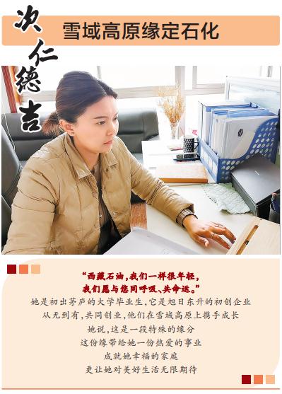 “感恩与西藏石油的缘!”这缘分带给次仁德吉一份热爱的事业,成就她幸福的家庭,更让她对美好生活无限期待。她说:“西藏石油,我们一样很年轻,我们愿与您同呼吸、共命运。”2020年,次仁德吉通过全员竞聘进入新成立的企业管理与监督部,希望能继续在这片热土上与企业共同成长。