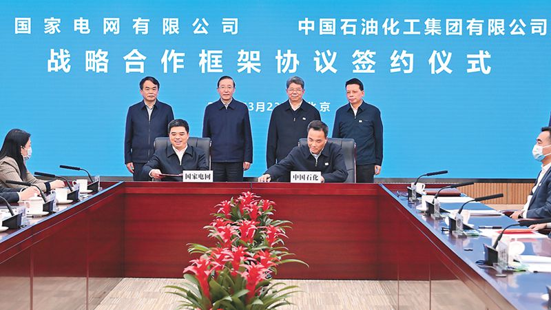 中国石化新闻网讯 记者符 慧报道:3月23日,中国石化与国家电网在北京签署战略合作框架协议。集团公司董事长、党组书记马永生,国家电网董事长、党组书记辛保安出席签约仪式并座谈。