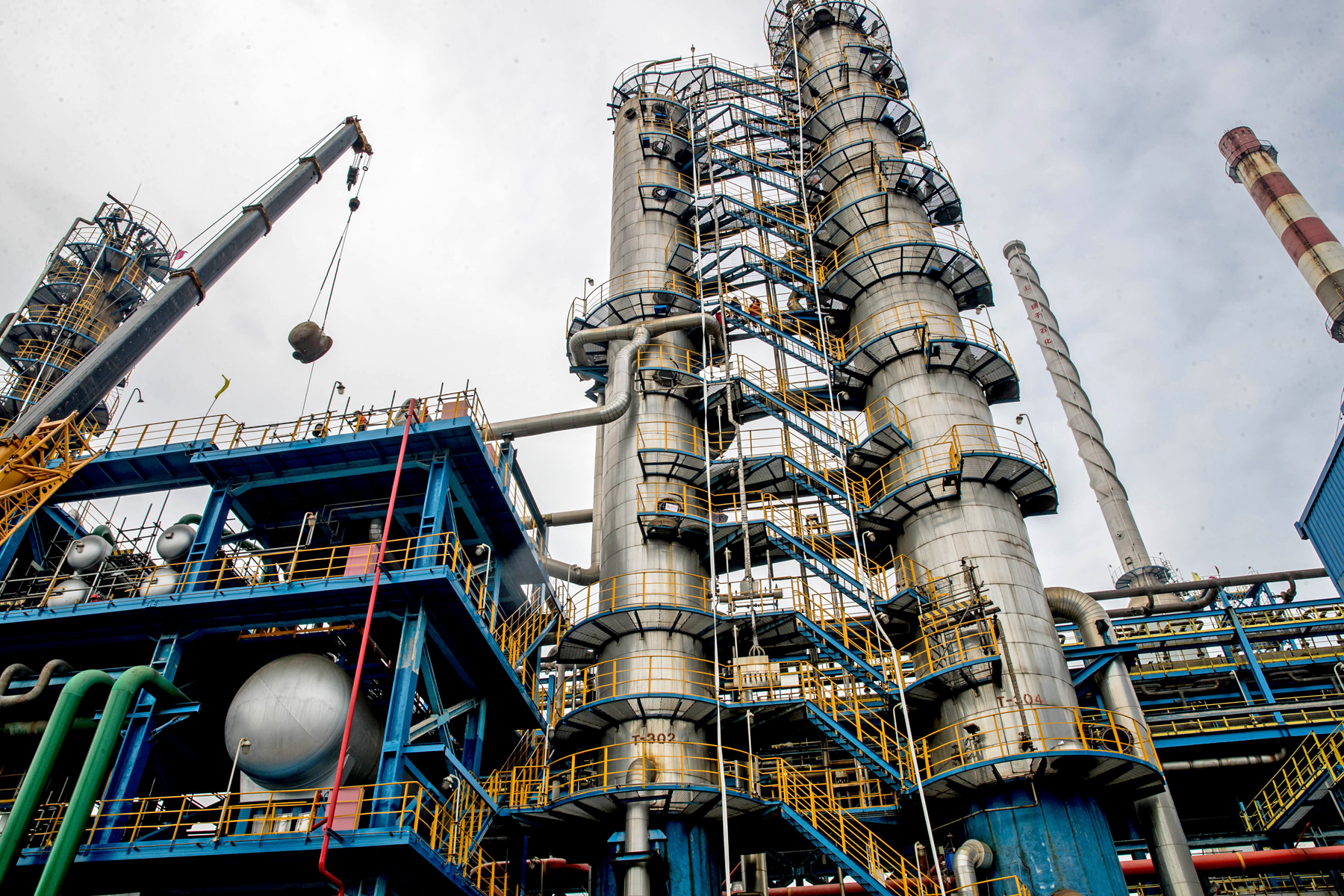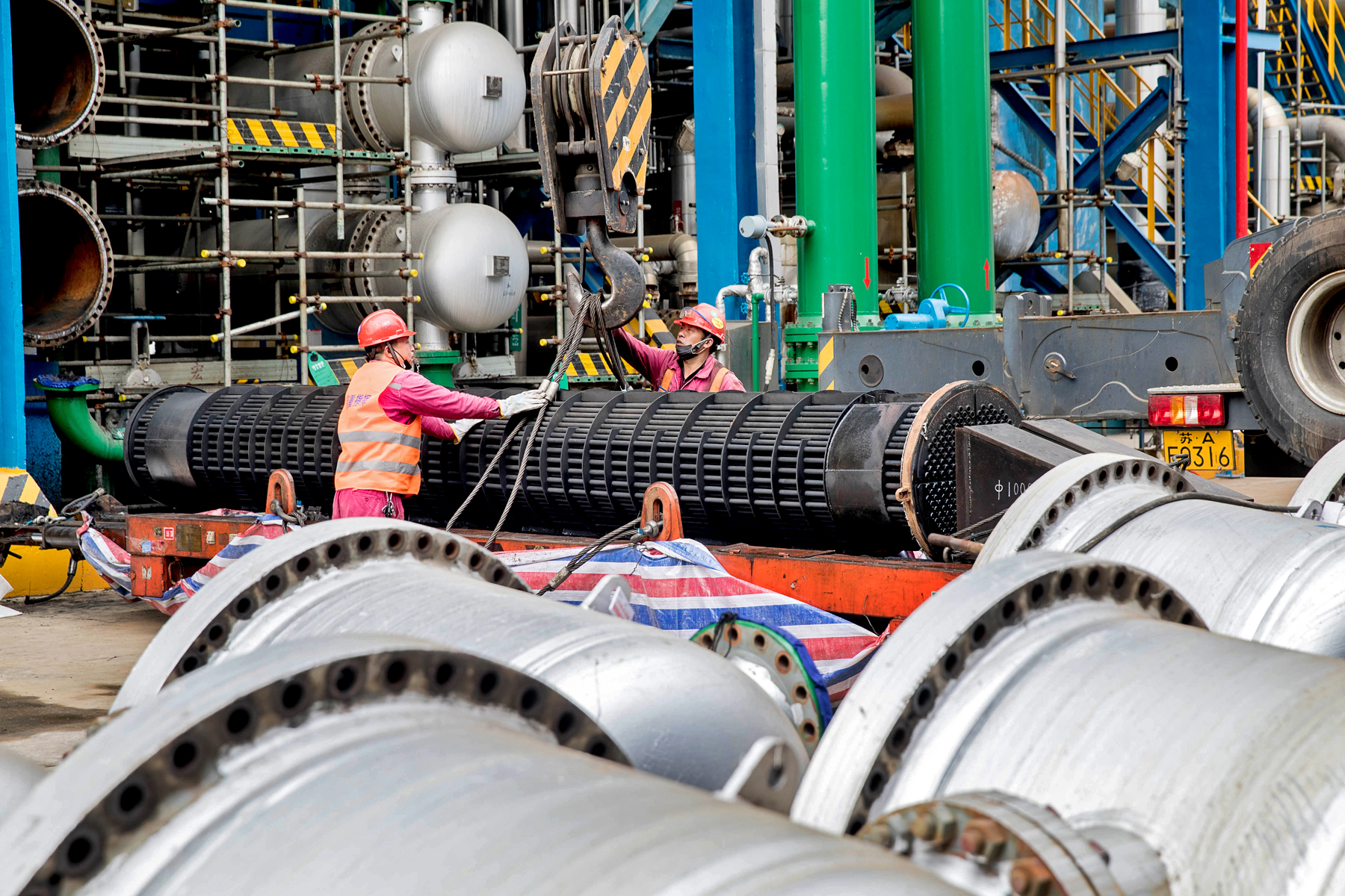 4月5日,检修人员正在扬子石化炼油厂检修现场进行换热器吊装