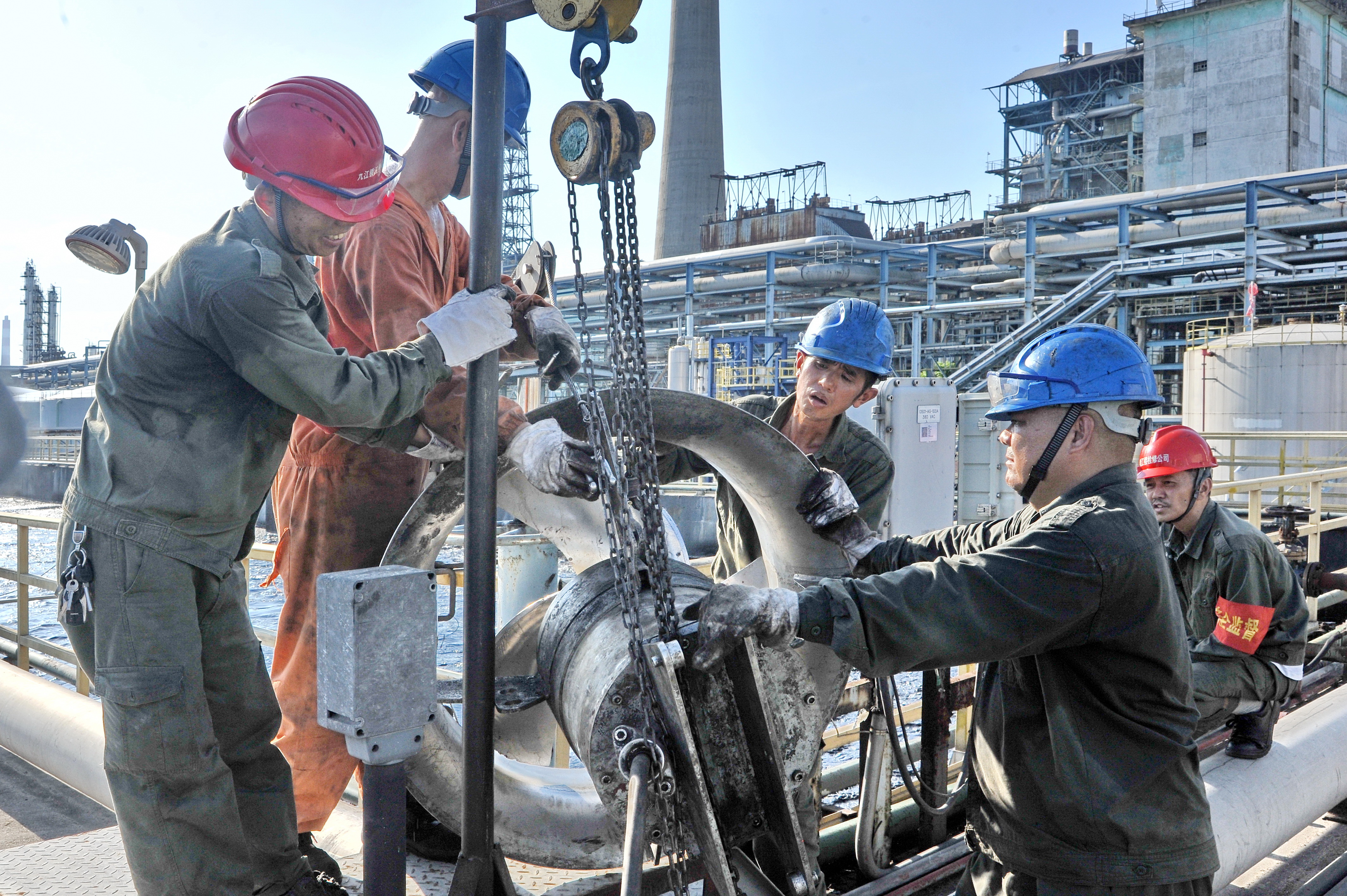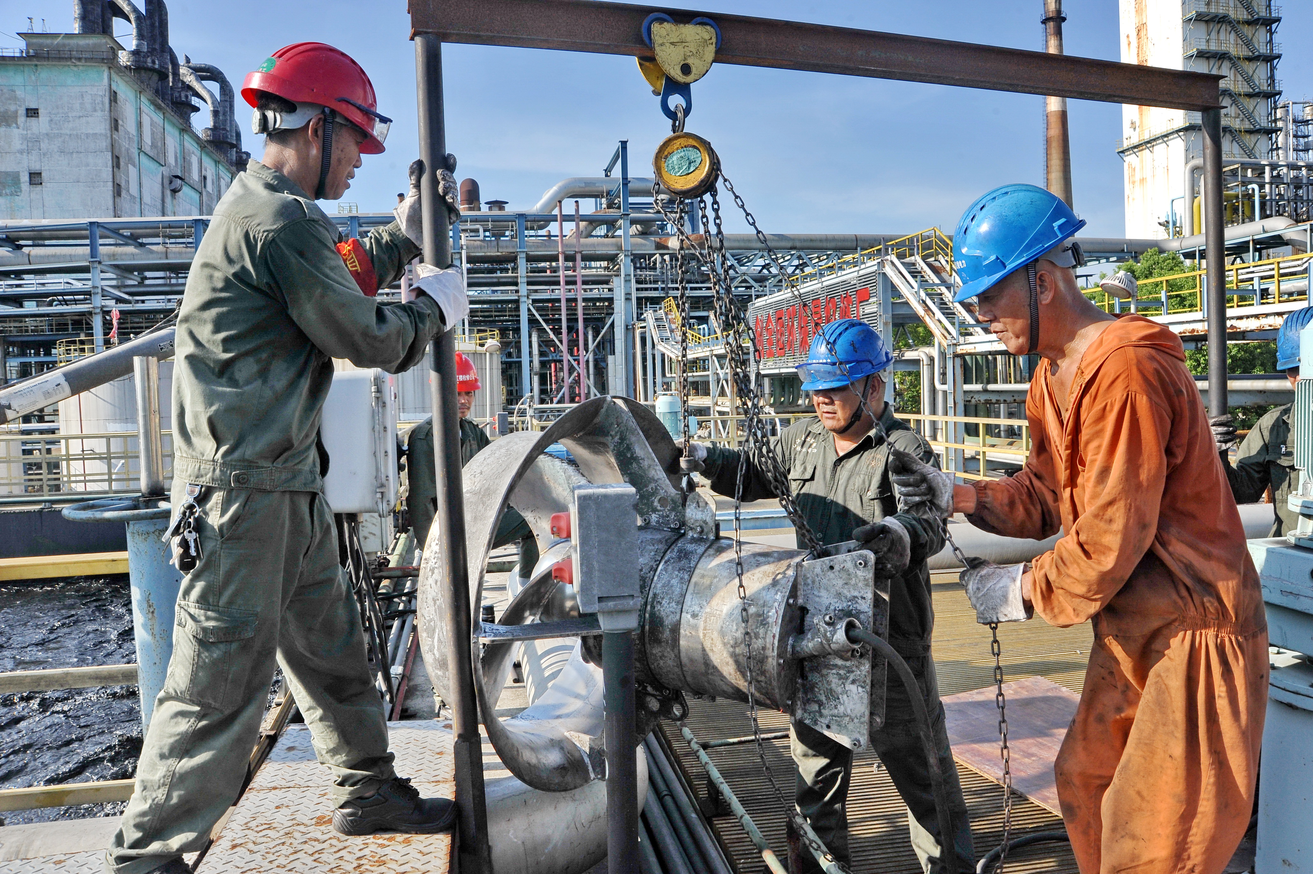中国石化新闻网讯(柯斌) 连日高温酷暑,九江石化水务运行部认真抓好生化装置水下设备隐患的排查检修工作,扎实做好高温天气设备安全运行检修维护保养工作,及时发现隐患及时安排检修排除,确保污水处理装置安全生产运行正常。8月9日检修师傅战高温酷暑,坚守奋战现场,错开高温时段,下午3点后开始检修,将含油生化AG103A水下推进器检修回装完成。电气配合进行接线和试机的工作,正常后交班组投用。