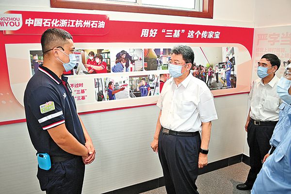 8月31日,马永生在浙江杭州石油秋涛路加油站了解“三基”工作开展情况。记者 章铮 万里 舒志国 摄影报道