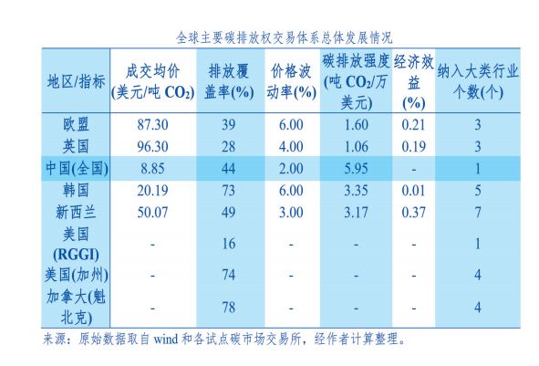 相较于其他全球主要碳排放权交易体系,中国碳排放强度处于较高水平(5.95吨二氧化碳/万美元),全国碳市场成交均价和价格波动率处于较低水平(分别为8.85美元/吨二氧化碳和2%)。