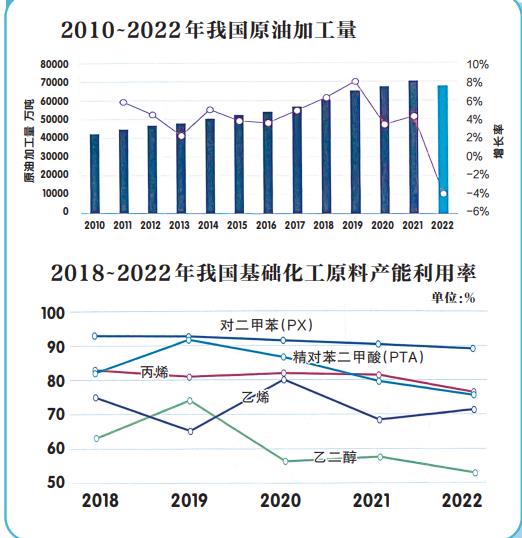 2.基础石化原料仍处在产能投放高峰期,生产供应能力进一步提高。近年我国乙烯、丙烯、乙二醇、对二甲苯(PX)和精对苯二甲酸(PTA)产能增长较快,其中,乙烯和PX自给率不断提高;丙烯和PTA产能进一步增加,产能利用率略有下降,乙二醇产能利用率结构性差异明显。