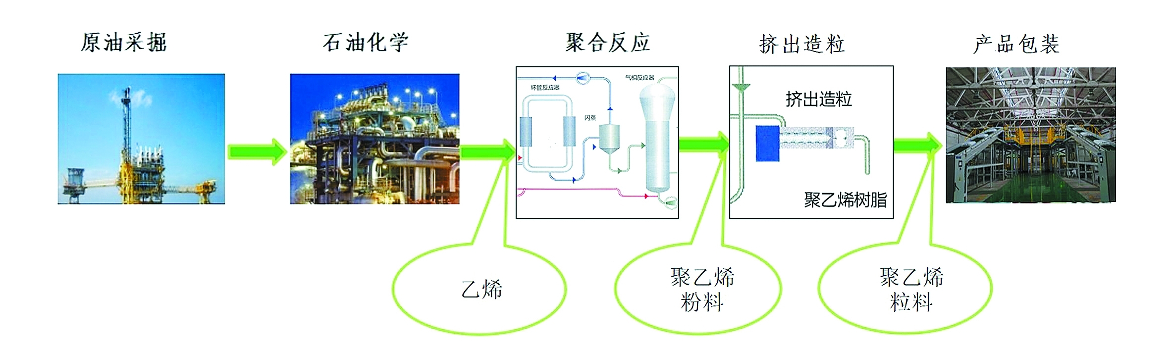石油通过开采运输到炼油厂,经过加工制成聚合级乙烯、丁烯、己烯等原料。