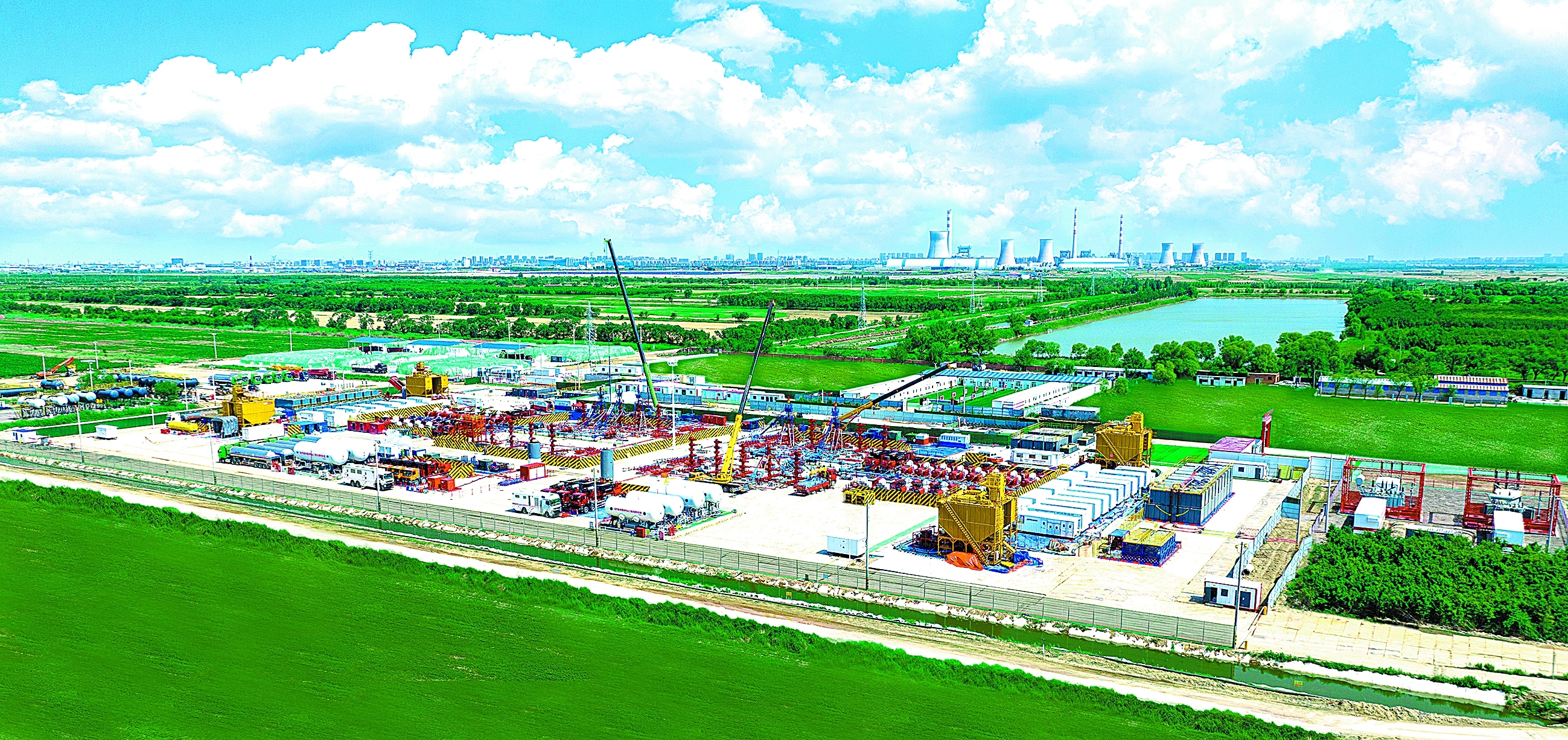 近日,由胜利石油工程公司负责施工的胜利油田牛页一区试验井组完成二号电驱压裂机组开工验收并运行,这是国内页岩油区块首次采用单井组“双机组”压裂作业的施工平台,标志着国家级页岩油示范区储层改造全面进入攻坚阶段。图为该井组电驱压裂现场。李 佳 摄 顾珍时 文