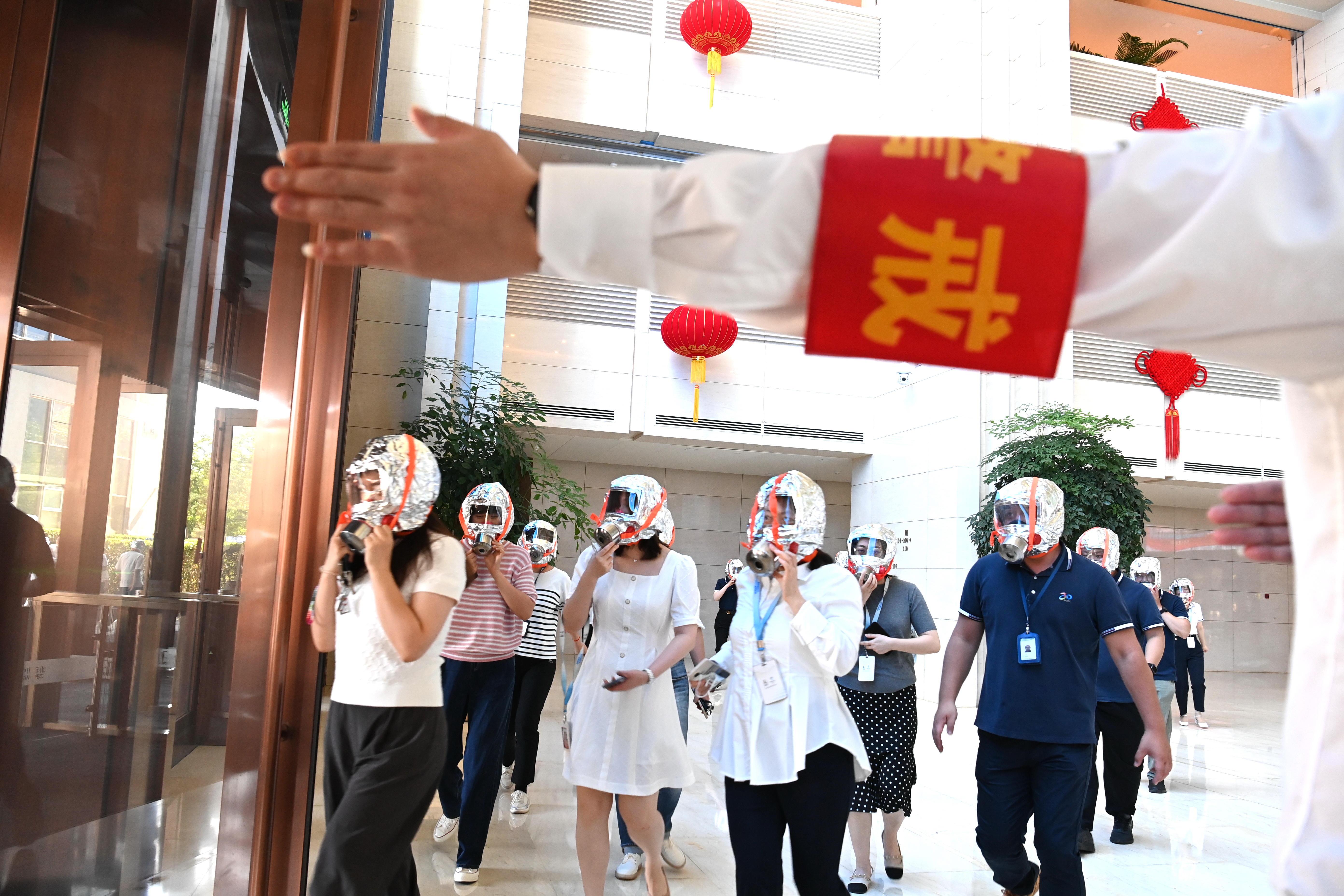 图为总部办公区工作人员接到“火警”后,头戴消防自救呼吸器迅速有序向大楼外撤离。