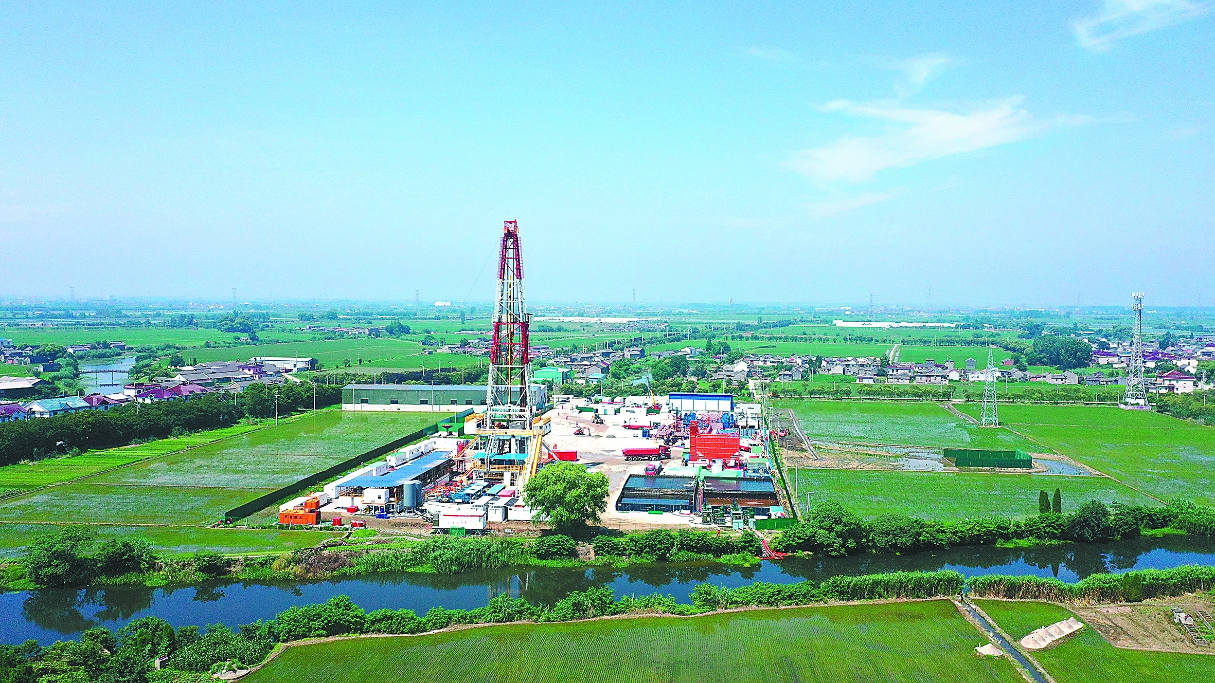 华东油气分公司采用工厂化钻井、电驱压裂、自动化远程控制等成套低成本页岩油开发应用技术,实现平均每米钻井和压裂成本大幅下降,展现了苏北盆地良好的页岩油勘探开发前景。苏北盆地2020年以来先后有4口井累计产量突破万吨,截至目前,页岩油总产量近9万吨。图为位于江苏泰州的页岩油示范区溱页1平台钻井和压裂施工现场。本报记者 沈志军 摄 通讯员 耿 捷 文