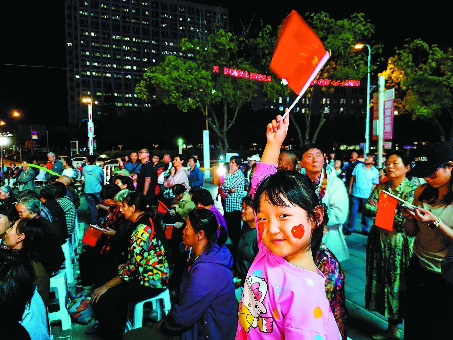 节日前夕,仪征化纤生活区举办了佳节同庆晚会。社区居民欢聚一堂,看演出、玩游戏。一个小朋友高高举起五星红旗,面对镜头,骄傲又自信。