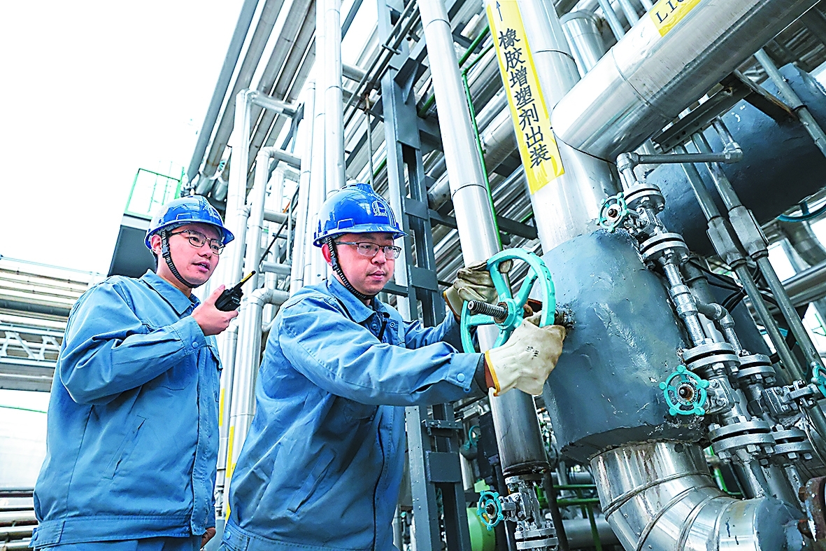 济南炼化润滑油部员工调控环保型芳烃橡胶增塑剂产品出装。