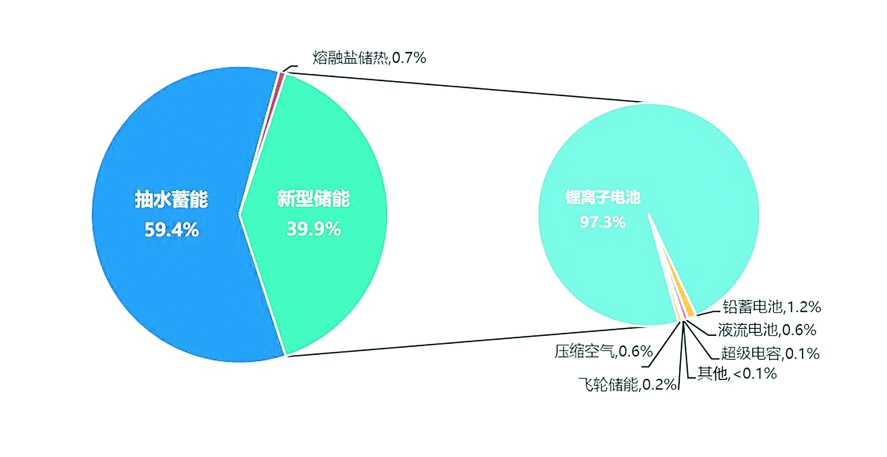 截至2023年,我国已投运电力储能项目累计装机规模86.5吉瓦,比上年增长45%;抽水蓄能累计装机规模51.3吉瓦,比上年增长11%。抽水蓄能累计装机规模占比首次低于60%。新型储能装机规模占比比上年增长18.2个百分点。在新型储能中,锂电储能装机规模占比从94%提高到97.3%。