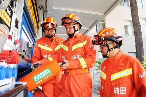 河南油田应急救援中心抓实器材装备一日三检、“六熟悉”联动演练,提升应急队伍处置能力,以“时刻准备着”的作战状态,筑牢油区安全生产屏障。图为6月11日,应急救援中心检查供气消防车空气呼吸器充装设备。石海波 摄