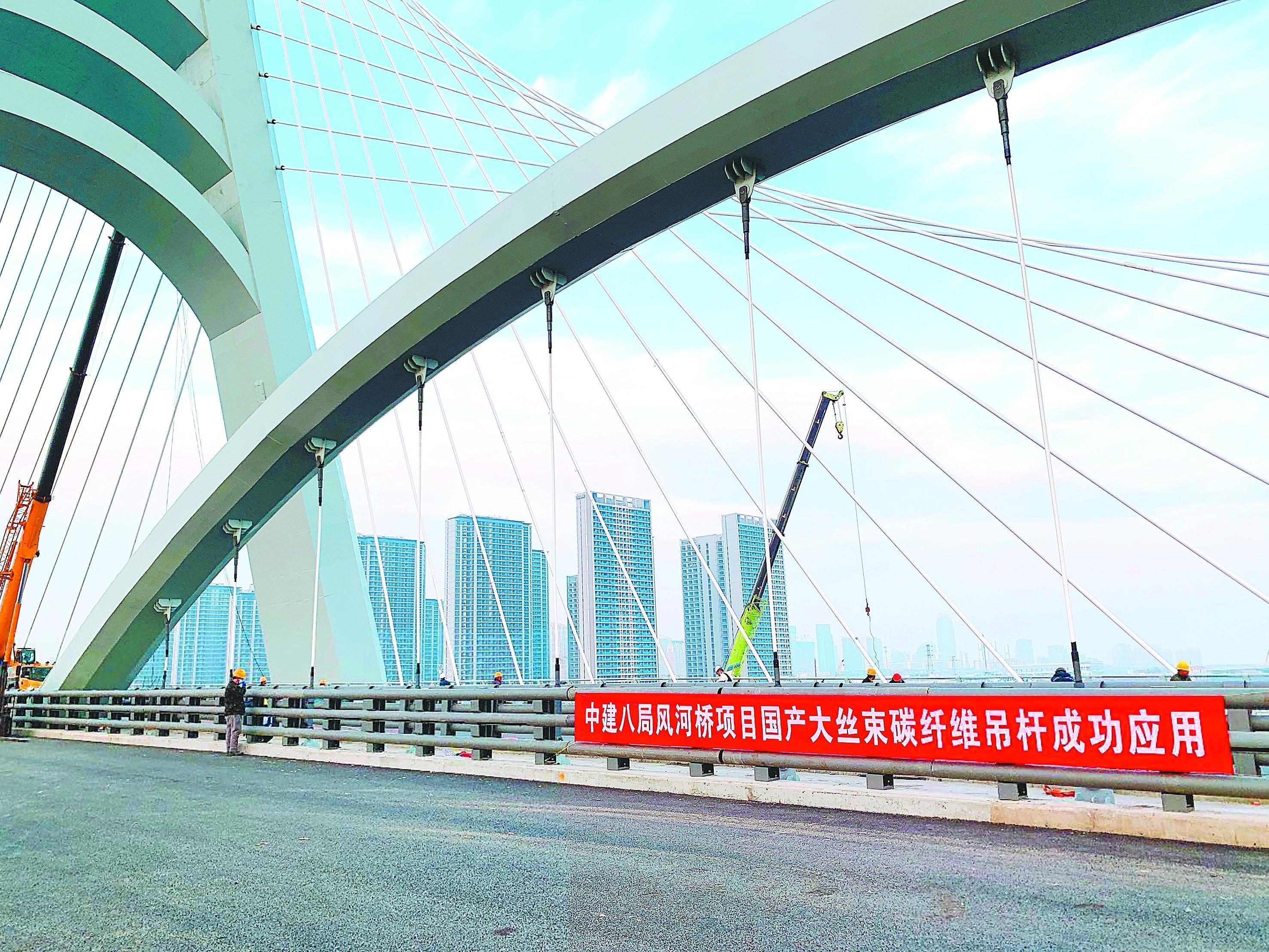 2022年12月,中建八局采用上海石化48K大丝束碳纤维筋研发的碳纤维吊杆,成功应用于青岛海口路跨风河大桥,是我国首个应用大丝束碳纤维索锚体系的桥梁工程。