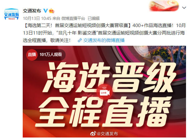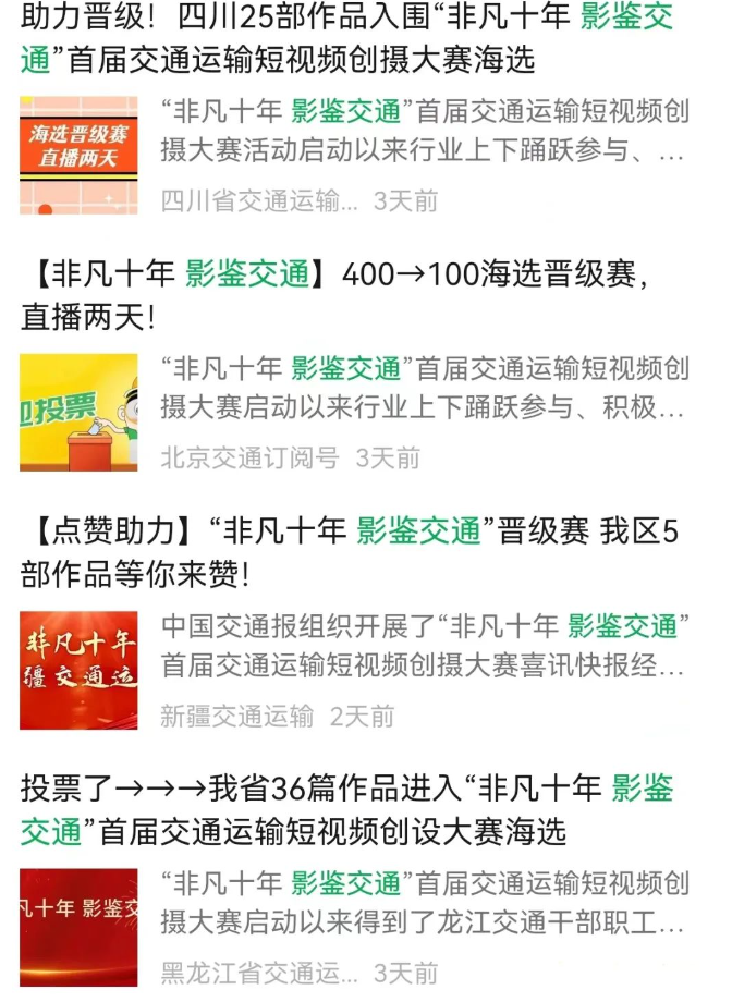 中国交通报社举办的“‘非凡十年 影鉴交通’首届交通运输短视频创摄大赛”活动围绕“人、景、绩、事、识”五大板块,吸引了300余家单位的400余部作品参赛,集中展现近年来我国交通运输的辉煌成就。