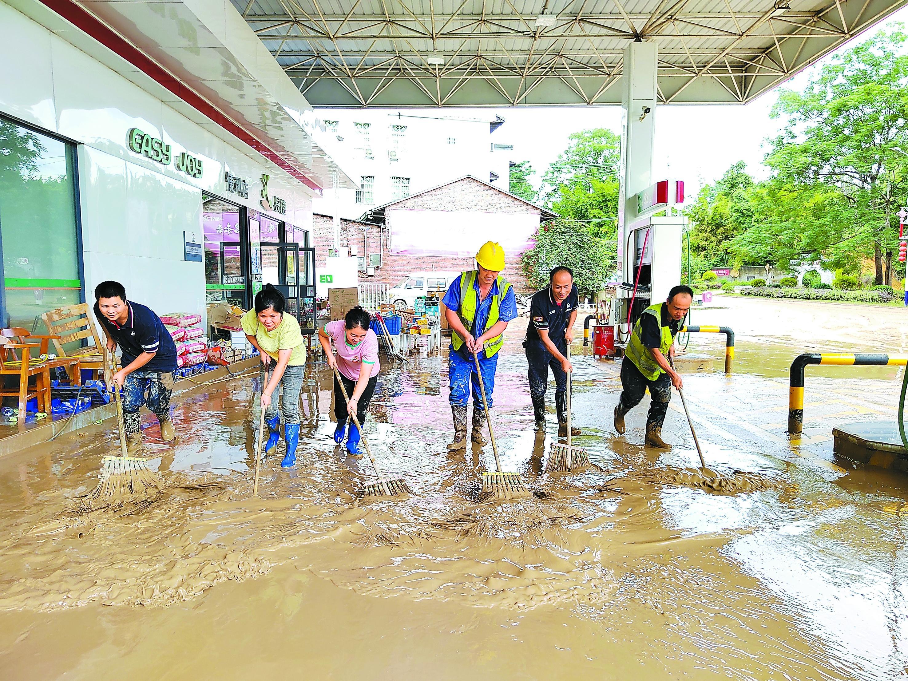 6月20日20时,广西柳州市洪水渐退,城市道路堆积了大量淤泥、垃圾,柳州石油迅速调配油罐车到达清淤现场,为消防照明车、清淤挖掘机提供加油服务,助力地方联勤联防部门疏通清理道路,帮助居民生产生活恢复正常。