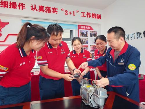 近日,贵州六盘水石油充分发挥技术骨干“传帮带”作用,组织经验丰富的设备管理大师傅为新员工培训,现场讲解设备性能和工作原理等知识。图为7月15日,红山二加能站站长张德林为新员工讲解真空泵的工作原理。易建华 摄 谭秋波 文