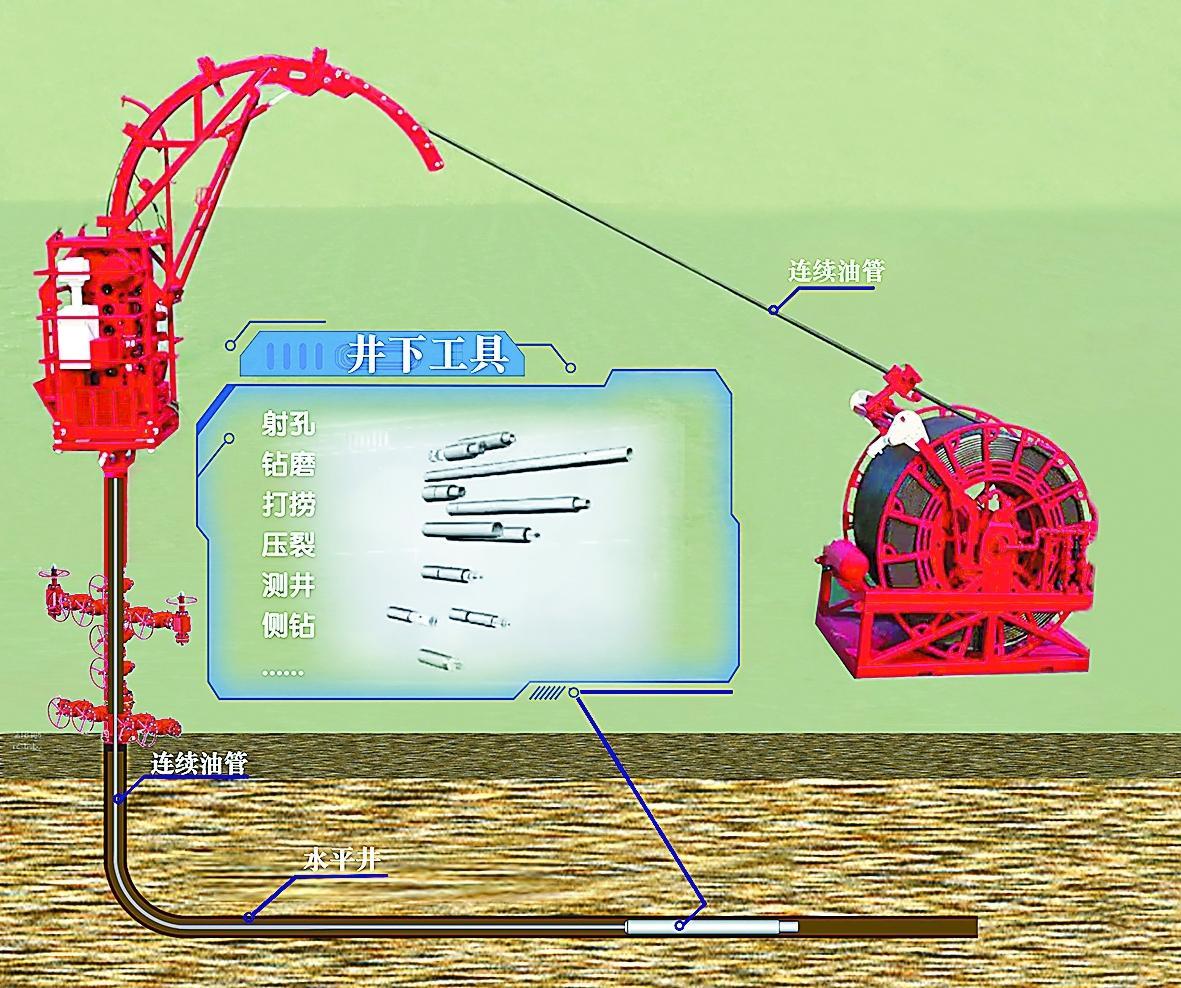 连续油管又称挠性油管、盘管或柔性油管,单根长度可达几千米,通过挂接不同工具组合,可进行连续油管修井、测井、钻井等多种作业,因此又被称为“万能作业机”。